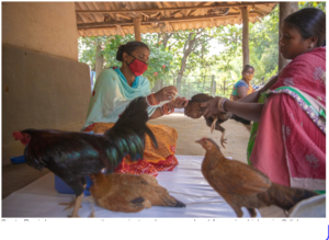 Geeta Rani Jena, a community vaccinator, deworms a local farmer’s chicken in Odisha, India.