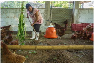 Georgina Vazquez Perez stirs the litter in her chicken coop to even out moisture that prevents bad smells and the spread of diseases.